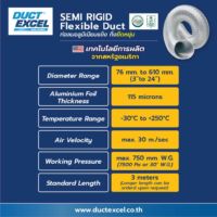 Aluminum Duct (Semi-Rigid Flexible Duct) SEMIDEC Model is a semi-rigid duct made from aluminum sheets. It can be bent without deformation, is resistant to vapors, chemicals, and weather conditions, has a long lifespan, is durable, easy to install, and suitable for ventilation and air delivery applications. Available in sizes from 3 inches to 20 inches.
